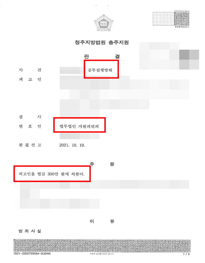 피고인의 변호인 법무법인 지원피앤피는 피고인에게 형사처벌전력이 없는 점을 비롯하여 공무집행방해의 정도, 범행 당시 피고인의 상태 등을 참작하여 달라는 의견을 주장하였습니다.