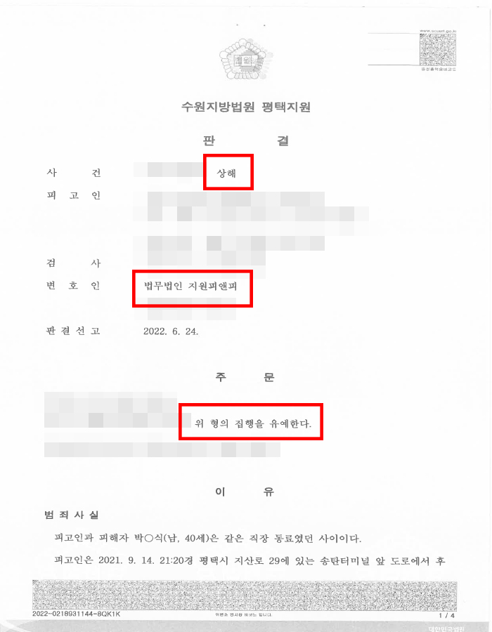 피고인의 변호인 법무법인 지원피앤피는 피고인이 피해자에게 상당한 금액을 지급하고 피해자와 원만히 합의하여 피해자가 피고인의 처벌을 원하고 있지 아니한 점, 피고인이 자신의 범행을 인정하고 반성하고 있는 점, 이 사건과 피고인이 마지막으로 폭력 관련 범행으로 처벌받은 시점인 2010년과 이 사건 사이에 상당한 시간적 간격이 있는 점 등을 참작하여 달라고 재판부에 전달하였습니다.