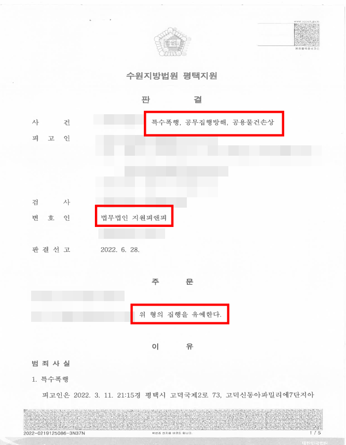 피고인의 변호인 법무법인 지원피앤피는 피고인이 무인텔 운영자와 원만히 합의하여 그가 피고인의 처벌을 원하지 않고 있다는 점, 피고인이 이전에 처벌받은 전력이 없는 점 등을 참작하여 줄 것을 재판부에 전달하였습니다.
