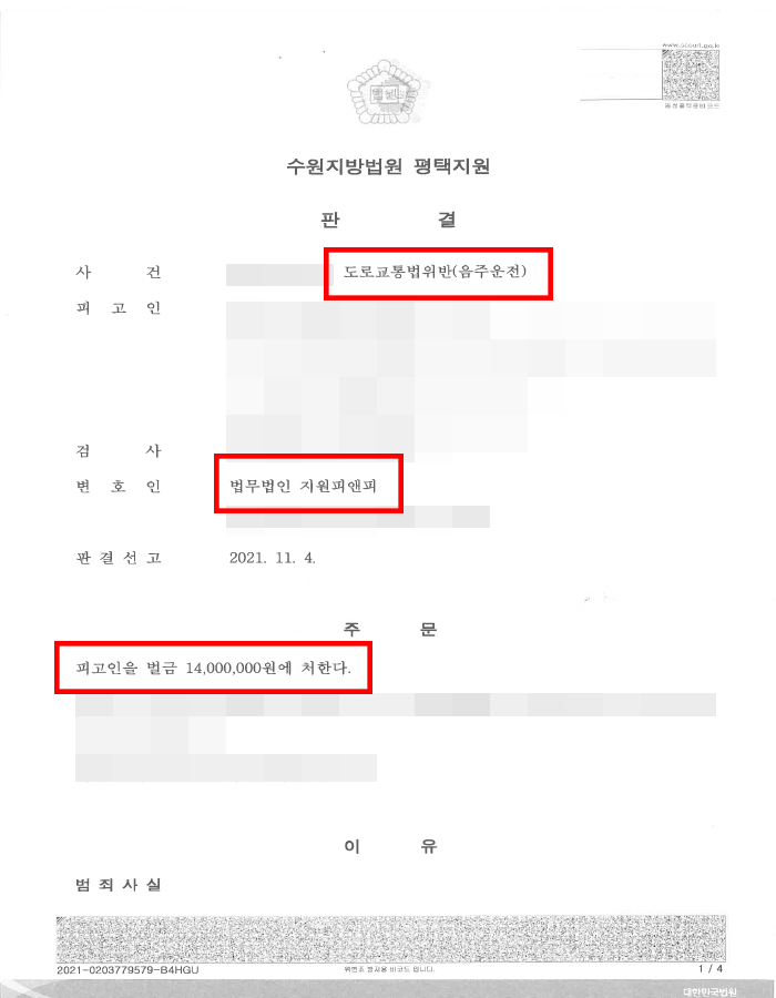 피고인의 소송대리인 법무법인 지원피앤피는 피고인이 자백하고 진지하게 반성하고 있으며 다시는 음주운전을 하지 않겠다고 다짐하고 있는 점, 이러한 의미에서 이 사건 차량을 처분한 점, 이 사건 발생 후 금주를 위한 치료를 꾸준히 받고 있는 것으로 보이는 점, 금고 이상의 형의 선고 시 실직할 가능성이 큰 점, 대리운전기사를 호출하여 대리운전기사가 배정되기까지 대기하였으나 상당한 시간이 지나도록 대리운전기사가 오지 않자 음주운전을 하게 된 것으로 보이는 점, 기존 음주운전으로 인한 벌금형 1회 외에는 다른 처벌 전력이 없는 점 등을 참작하여 주시기 바란다는 의견을 재판부에 주장하였습니다.