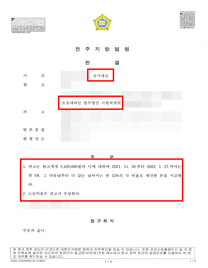 원고의 소송대리인 법무법인 지원피앤피는 원고와 피고의 거래사실이 드러나 있는 문자내역과 공사완공사진, 설계도 등을 재판부에 제출하였습니다.