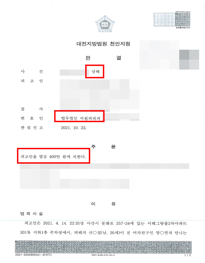 피고인의 소송대리인 법무법인 지원피앤피는 피고인과 피해자가 합의한 점, 형사처벌경력이 없는 점 등의 양형조건을 참작해 달라는 의견을 전달하였습니다.