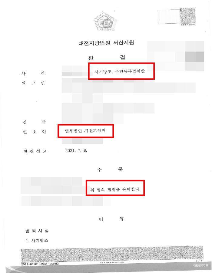 또한, 피고인은 현금인출기에서 보이스피싱 조직원의 지시에 따라 수거한 보이스피싱 피해금 중 100만 원을 무통장 송금하면서, 송금자 인적사항에 위 조직원으로부터 텔레그램 메신저를 통해 전송받은 타인의 주민등록번호를 이용한 것을 비롯하여, 그때부터 총 17회에 걸쳐 타인의 주민등록번호를 이용하여 무통장 송금하였습니다.