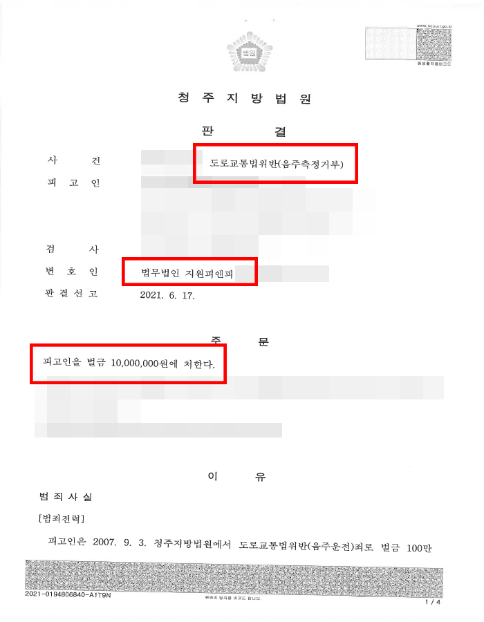 피고인은 2007년 도로교통법위반(음주운전)죄로 벌금 100만 원을 선고 받았습니다.