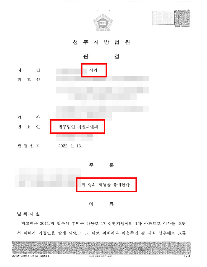 피고인의 변호인 법무법인 지원피앤피는 이 사건 범행을 인정하면서 잘못을 반성하고 있는 점, 피해회복을 위하여 현재까지 약 1억원 상당의 금액을 지급한 것으로 보이는 점 등 유리한 정상이 있다고 주장하였습니다.