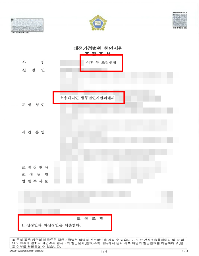 신청인의 소송대리인 법무법인 지원피앤피는 당사자들의 기본증명서 및 혼인관계증명서, 신청인과 피신청인의 메세지 대화내역, 피신청인의 유책사유가 담긴 피신청인과 시부모의 대화내역 등을 재판부에 모두 제출하였습니다.