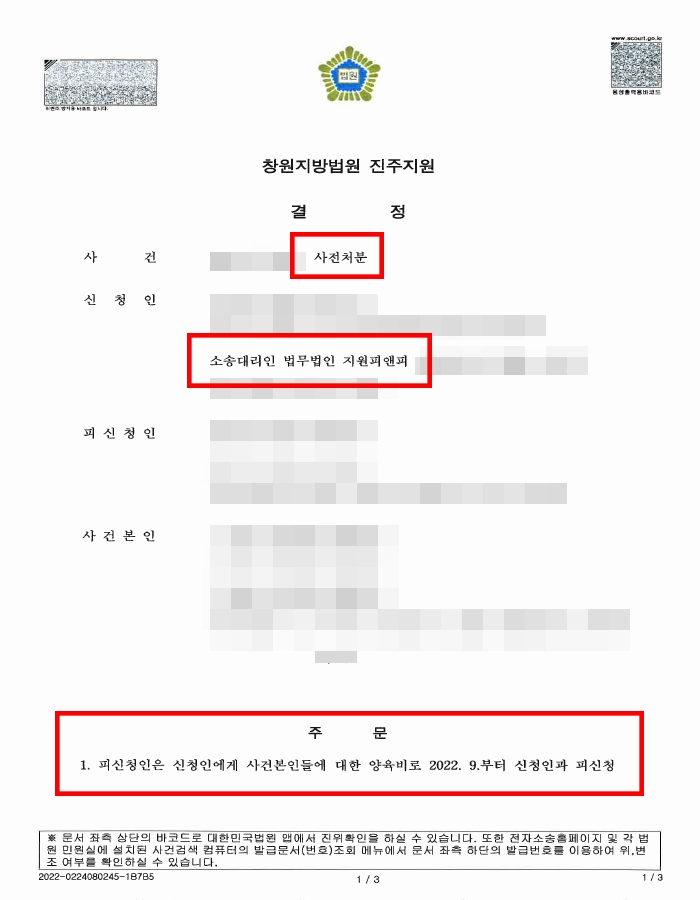 신청인의 대리인 법무법인 지원피앤피는 신청인이 정기적인 수입이 많지 않은 가운데 홀로 사건본인들의 양육비를 전적으로 부담하고 있는 상황에 처하여 생활의 어려움을 겪고 있다는 점을 감안하여 부디 신청취지와 같은 사전처분 결정을 내려주시기 바란다는 의견을 재판부에 전달하였습니다.