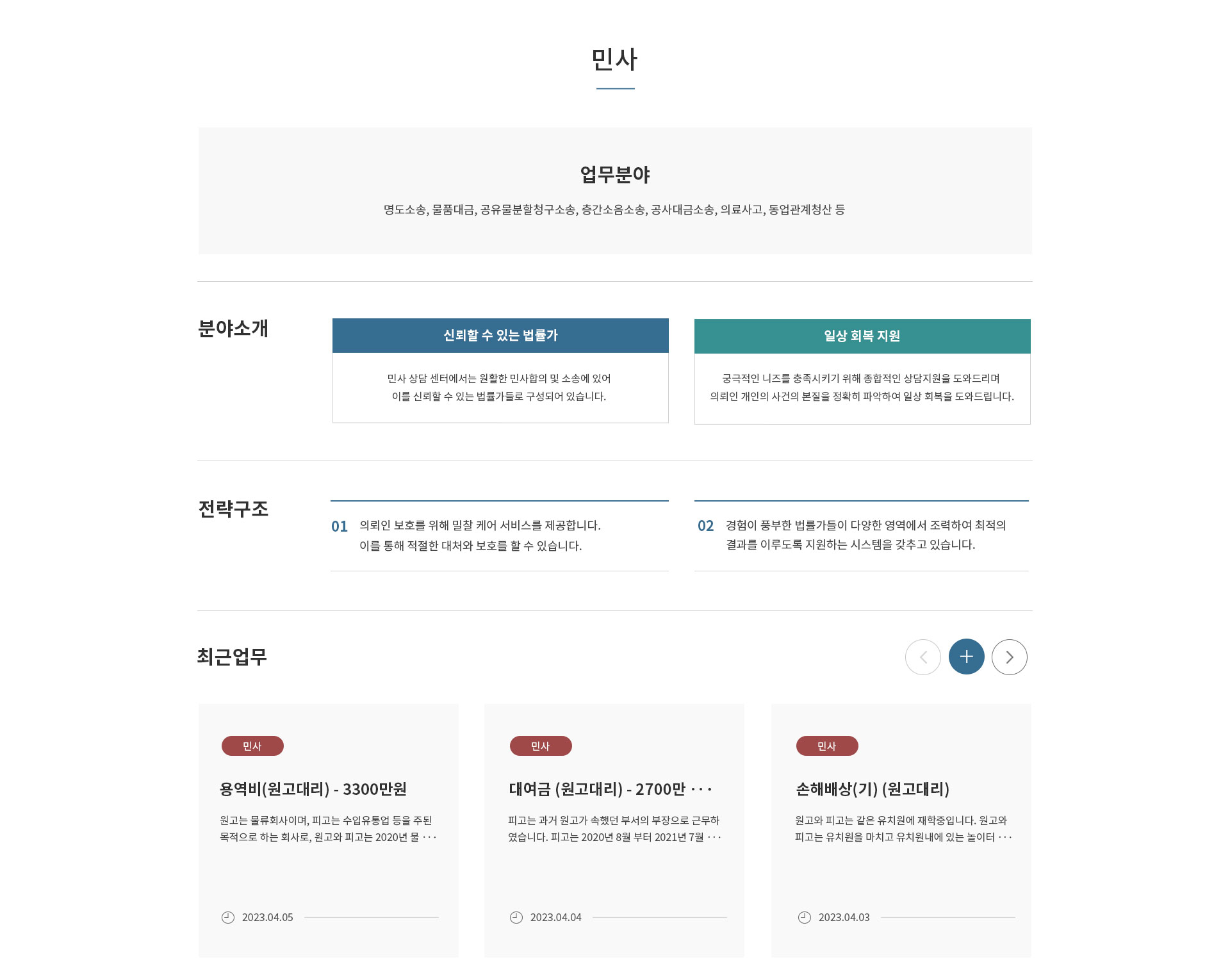 명도소송, 물품대금, 공유물분할청구소송, 층간소음소송, 공사대금소송, 의료사고, 동업관계청산 등